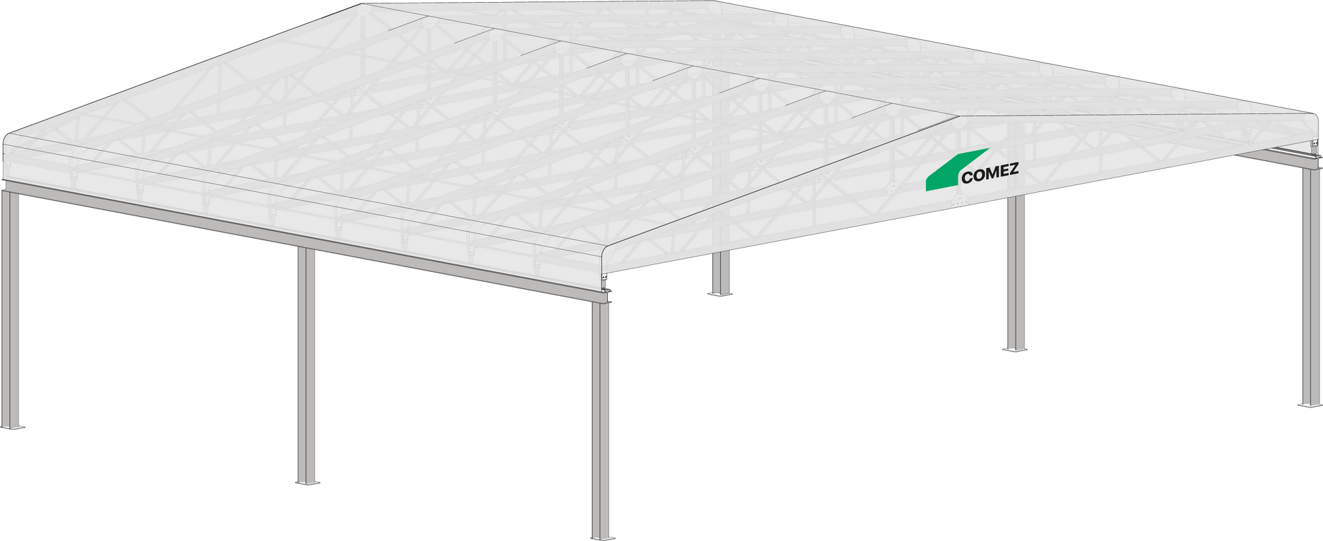 La Tettoia Mobile è composta da una struttura portante fissa costituita da pilastri e travi aeree, dove sono alloggiate le monorotaie che permettono lo scorrimento della copertura